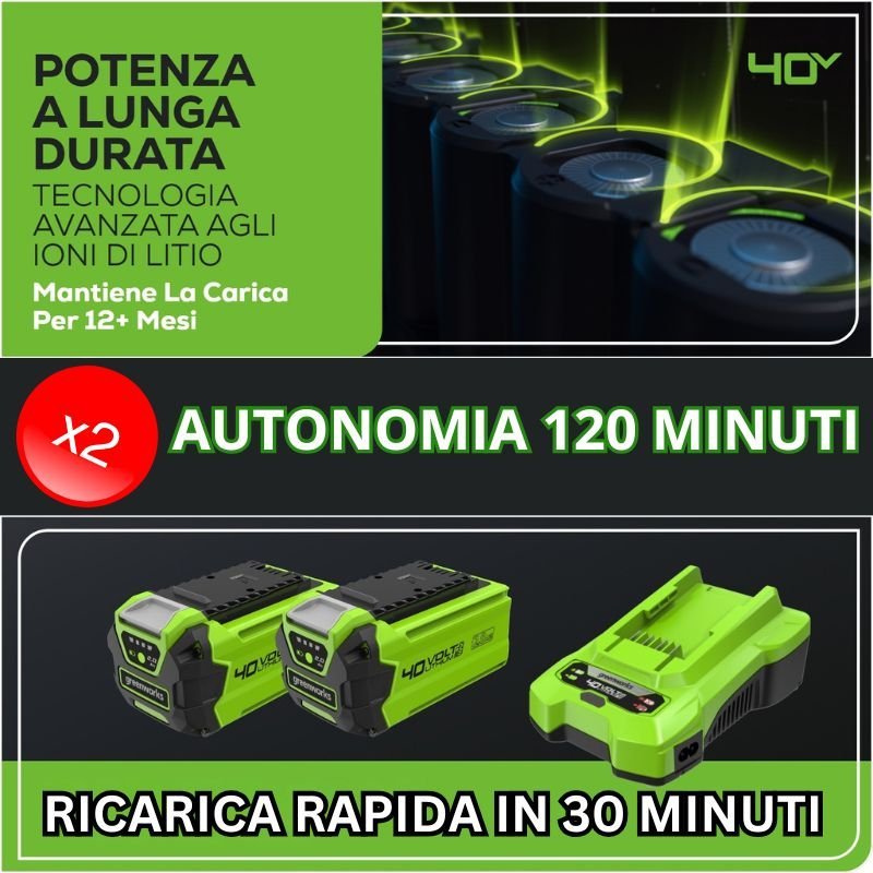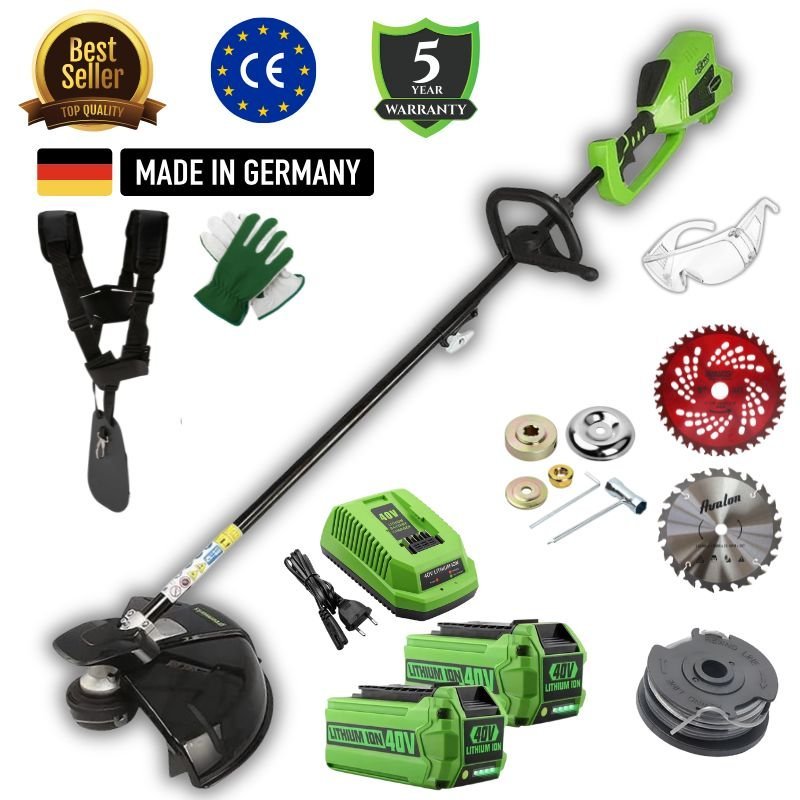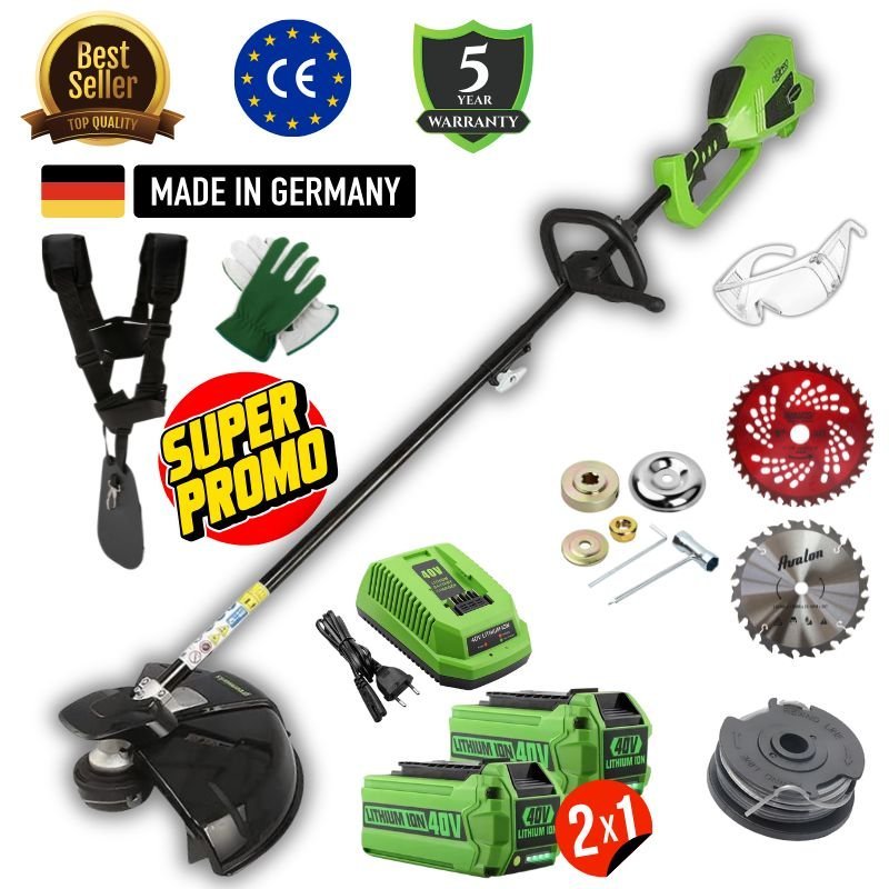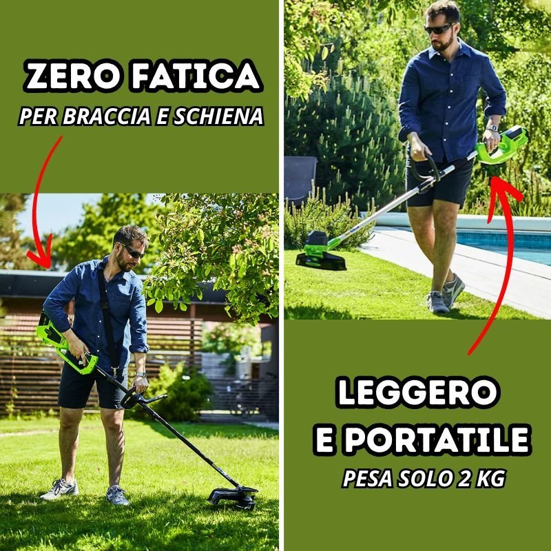 Nuovo Decespugliatore Green V40® con motore Brushless da 900W ad alte prestazioni. Incluso Kit di Accessori: Lame, Bobine filo, 2 Batterie, Caricatore Rapido, Imbracatura, Set Attrezzi